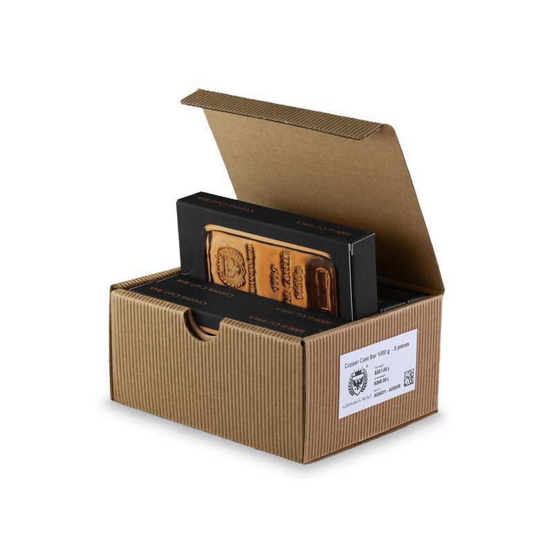 Germania Mint 1000 g Kupferbarren, hergestellt aus 999,9 Kupfergranulat. Die Produkte haben eingravierte individuelle Nummern und aufgebrachte Hologramme mit Identifikationscodes. Die Barren sind vakuumfoliert und in exklusiven Schachteln verpackt, die sie nicht nur zu einer Investition, sondern auch zu einem Sammlerstück machen.